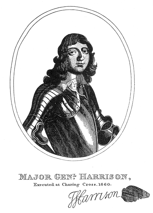 Le hasard mentionné par Pepys résume assez bien la situation du major Harrison : lors de la guerre civile anglaise, il s'est battu aux côtés du Parlement contre le roi Charles I. Proche de Cromwell, il siégeât comme juge au procès du roi et fut l'un des 59 régicides qui ont signé sa condamnation à mort. Charles Ier fut donc décapité (les français n'ont ni le monopole ni la primeur d'avoir procédé à une décollation royale !). À la restauration, c'est-à-dire lorsque le fils de Charles Ier, Charles II, fut appelé sur le trône, Harrison ne s'enfuit pas. Il attendit sereinement son arrestation et fut le premier régicide à être exécuté.