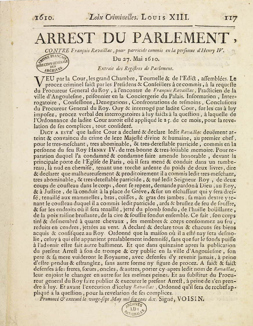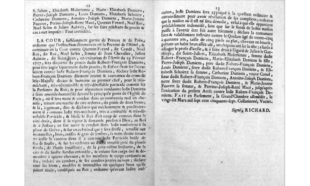Condamne ledit Damien à faire amende honorable devant la principale porte de l'Église de Paris, où il sera mené et conduit dans un tombereau, nu en chemise, tenant une torche de cire ardente du poids de deux livres […] sur un échafaud […] tenaillé aux mamelles, bras, cuisses et gras de jambes, sa main droite, tenant en icelle le couteau dont il a commis ledit parricide, brûlée de feu de souffre ; et, sur les endroits où il sera tenaillé, jeté du plomb fondu, de l'huile bouillante, de la poix-résine fondue, de la cire et du soufre fondus ensemble ; Et ensuite son corps tiré et démembré à quatre chevaux, et ses membres et corps consumés au feu, réduits en cendre, et ses cendres jetées au vent ;